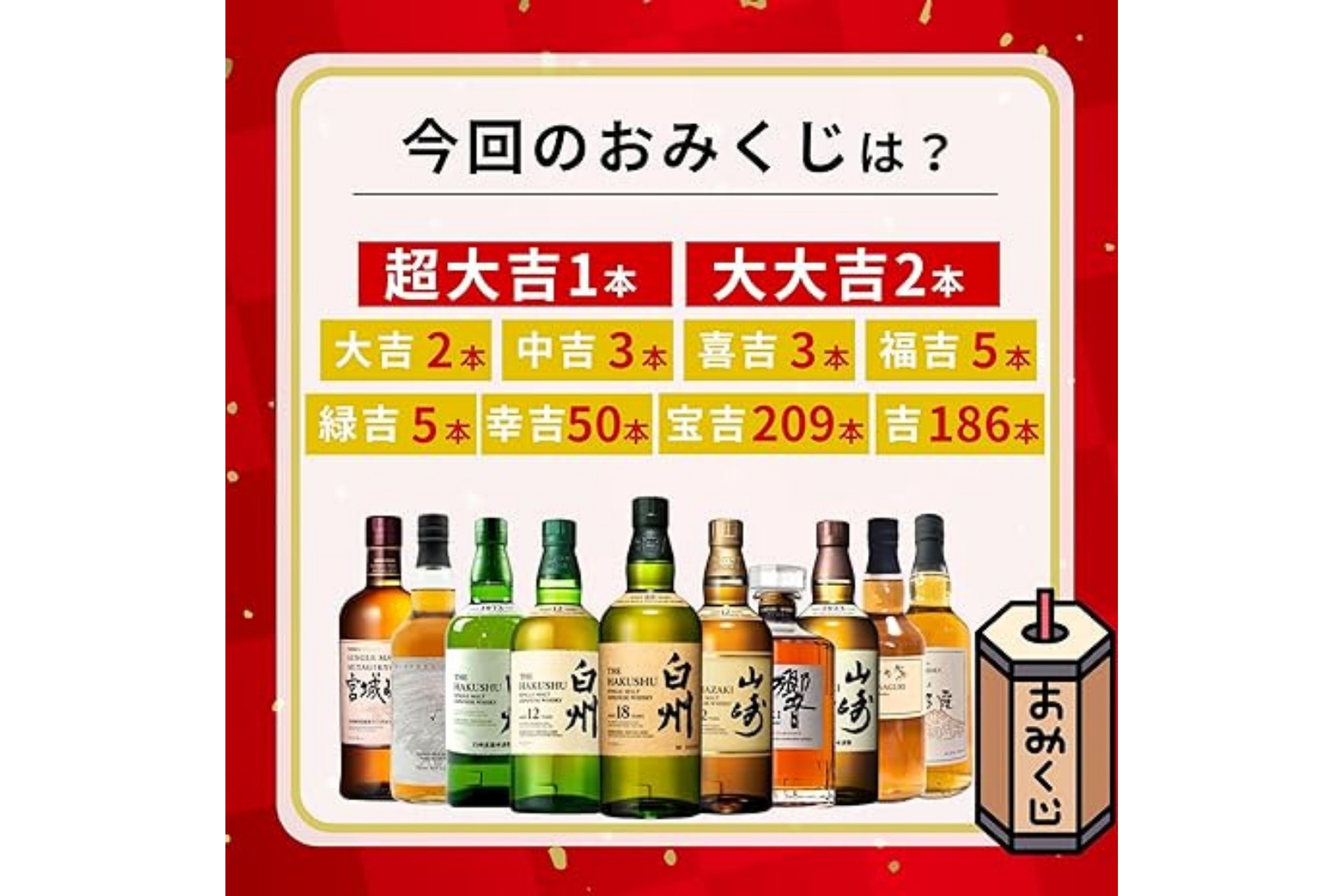 Amazon、1等「響21年」/2等「山崎12年」/3等「白州12年」の「特別企画 ウイスキーみくじ」第5弾発売